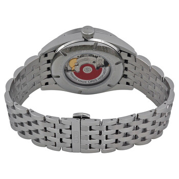 Stainless steel case with a stainless steel bracelet. Fixed stainless steel bezel. Silver dial with silver-tone hands and index hour markers. Minute markers. Days of the week around the outer rim. Dial Type: Analog. Date display at the 6 o'clock position. Automatic movement. Scratch resistant sapphire crystal. Pull / push crown. Case diameter: 42 mm. Round case shape. Water resistant at 100 meters / 330 feet. Functions: date, day, hour, minute, second. Casual watch style. Oris Silver Dial Stainless Steel Men's Watch 755-7691-4051MB.