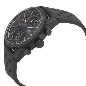Black DLC titanium case with a black rubber strap. Uni-directional rotating black DLC bezel. Black dial with luminous black hands and index hour markers. Minute markers. tachymeter markings around the outer rim. Dial Type: Analog. Luminescent hands and markers. Date display at the 6 o'clock position. Chronograph - three sub-dials displaying: 60 seconds, 30 minutes, and 12 hours. Oris calibre 774, base SW 500 automatic movement with a 48-hour power reserve. Scratch resistant sapphire crystal. Screw down crown. Solid case back. Case size: 44 mm. Case thickness: 14.90 mm. Round case shape. Band width: 22 mm. Fold over clasp. Water resistant at 100 meters / 330 feet. Functions: chronograph, tachymeter, date, hour, minute, second. Additional Info: limited edition of 500 pieces. Sport watch style. Watch label: Swiss Made. Oris Audi Sport Chronograph Black Dial Men's Watch 01 774 7661 7784-Set RS.