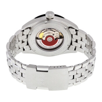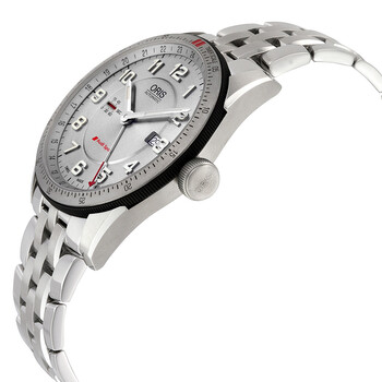 Stainless steel case with a stainless steel bracelet. Bi-directional rotating silver-tone bezel. Silver-tone dial with luminous silver-tone hands and Arabic numeral hour markers. 24 hour markers. Minute markers around the outer rim. Dial Type: Analog. Luminescent hands and markers. Date display at the o'clock position. Linea seconds subdials. Oris calibre 747, base SW 220-1 automatic movement with a 38-hour power reserve. Scratch resistant sapphire crystal. Screw down crown. Transparent case back. Round case shape. Case size: 44 mm. Case thickness: 11.6 mm. Band width: 22 mm. Fold over clasp with a safety release. Water resistant at 100 meters / 330 feet. Functions: date, GMT, second time zone, hour, minute, small second. Casual watch style. Watch label: Swiss Made. Oris Audi Sport GMT Automatic Men's Watch 01 747 7701 4461-07 8 22 85.