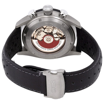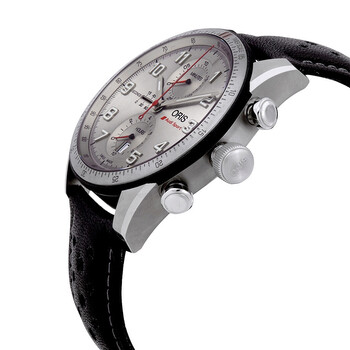 Silver-tone titanium case with a black leather strap. Minutes scale silver-tone tungsten bezel. Silver dial with silver-tone hands and Arabic numeral hour markers. Timer scale. Dial Type: Analog. Luminescent hands and markers. Date display at the 6 o'clock position. Chronograph - three sub-dials displaying: 60 second, 30 minute and 12 hour. Oris Calibre 774, base SW 500 Automatic movement, containing 25 Jewels, bitting at 28800 vph, and has a power reserve of approximately 48 hours. Scratch resistant sapphire crystal. Transparent case back. Round case shape, case size: 44 mm. Band width: 22 mm. Folding clasp. Water resistant at 100 meters / 330 feet. Functions: chronograph, date, hour, minute, small second. Additional Info: limited to 2000 pieces. Audi Sport Limited Edition Series. Sport watch style. Watch label: Swiss Made. Item Variations: R774 7661 7481SET, R774.7661.7481SET, R77476617481SET. Oris Audi Sport Limited Edition Automatic Men's Chronograph Watch 01 774 7661 7481-Set.