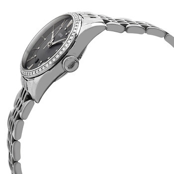 Stainless steel case with a stainless steel bracelet. Fixed stainless steel bezel set with diamonds. Grey dial with silver-tone hands and diamond-tipped index hour markers. Dial Type: Analog. Date display at the 6 o'clock position. Oris Caliber 561 automatic movement with a 38-hour power reserve. Scratch resistant sapphire crystal. Pull / push crown. Transparent case back. Round case shape. Case size: 28 mm. Band width: 14 mm. Deployment clasp with a push button release. Water resistant at 50 meters / 165 feet. Functions: date, hour, minute, second. Casual watch style. Watch label: Swiss Made. Oris Automatic Diamond Grey Dial Ladies Watch 01 561 7722 4953-07 8 14 79.