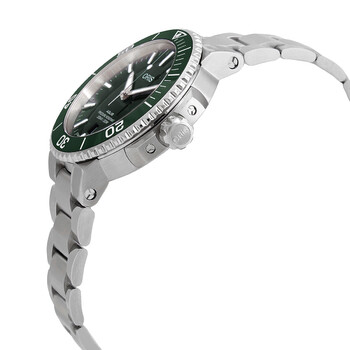 Stainless steel case with a stainless steel bracelet. Uni-directional rotating stainless steel bezel with an inlad green ceramic ring. Green dial with luminous silver-tone hands and index hour markers. Minute markers around the outer rim. Dial Type: Analog. Luminescent hands and markers. Date display at the 6 o'clock position. Oris calibre 733 automatic movement, based upon Sellita SW200-1, containing 26 Jewels, bitting at 28800 vph, and has a power reserve of approximately 38 hours. Anti-reflective scratch resistant sapphire crystal. Screw down crown. Transparent case back. Round case shape. Case size: 41.5 mm. Band width: 22 mm. Fold over clasp with a push button release. Water resistant at 300 meters / 1000 feet. Functions: date, hour, minute, second. Aquis Series. Dive watch style. Watch label: Swiss Made. Oris Automatic Green Dial Watch 01 733 7766 4157-07 8 22 05PEB.