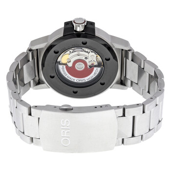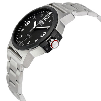 Stainless steel case with a stainless steel bracelet. Fixed black DLC bezel. Black dial with luminous hands and Arabic mineral hour markers. Minute markers around the outer rim. Luminescent hands and markers. Day of the week and date display above the 6 o'clock position. Automatic movement. Scratch resistant sapphire crystal. Skeleton case back. Case diameter: 42 mm. Case thickness: 12 mm. Fold over clasp with double push button release. Water resistant at 100 meters / 330 feet. Oris BC3 Advanced Day Date Stainless Steel Bracelet Men's Watch 735-7641-4364MB.
