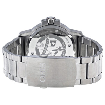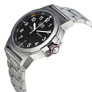 Stainless steel case with a stainless steel bracelet. Fixed stainless steel bezel. Black dial with luminous hands and Arabic numeral hour markers. Minute markers around the outer rim. Dial Type: Analog. Luminescent hands and markers. Date display appears at the 6 o'clock position. Day of the week displayed at the 9 o'clock position. Automatic movement with 38 hour power reserve. Scratch resistant sapphire crystal. Screw down crown. Solid case back. Case diameter: 42 mm. Round case shape. Band width: 22 mm. Fold over clasp. Water resistant at 100 meters / 330 feet. Functions: date, hour, minute, second. Sport watch style. Watch label: Swiss Made. Oris BC3 Air Racing Silver Lake Edition Automatic Black Dial Men's Watch 735-7641-4184SET.