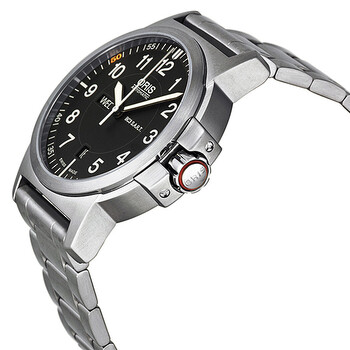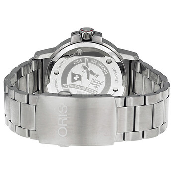 Stainless steel case with a stainless steel bracelet. Fixed bezel. Black dial with luminous hands and Arabic numeral hour markers. Minute markers around the outer rim. Dial Type: Analog. Luminescent hands and markers. Date display at the 6 o'clock position. Automatic movement with 38 hour power reserve. Oris 735 engine. Scratch resistant sapphire crystal. Screw down crown. Skeleton case back. Case diameter: 42 mm. Round case shape. Band width: 22 mm. Fold over clasp. Water resistant at 100 meters / 330 feet. Functions: date, hour, minute, second. Dress watch style. Watch label: Swiss Made. Oris BC3 Air Racing Silver Lake Edition Automatic Men's Watch 01 735 7641 4184-SET.