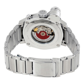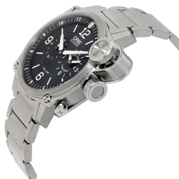 Silver-tone stainless steel case and bracelet. Fixed silver-tone bezel. Black dial with luminous hands and index hour markers. Arabic numerals mark the 6, 9 and 12 o'clock positions. Minute markers around the outer rim. Dial Type: Analog. Luminescent hands and markers. Date display at the 3 o'clock position. Two - 60 seconds and 12 hours (2 time zone) subdials. Oris calibre 690, base ETA 2836-2 automatic movement with a 38-hour power reserve. Scratch resistant sapphire crystal. Screw down crown. Skeleton case back. Case size: 42.7 mm. Case thickness: 13.5 mm. Round case shape. Band width: 22 mm. Band length: 8 inches. Deployment clasp. Water resistant at 100 meters / 330 feet. Functions: date, two time zone, flight timer, hour, minute, second. Additional Info: suitable for snorkeling, as well as swimming, but not diving. Casual watch style. Watch label: Swiss Made. Oris BC4 Flight Timer Automatic Black Dial Men's Watch 690-7615-4164MB.