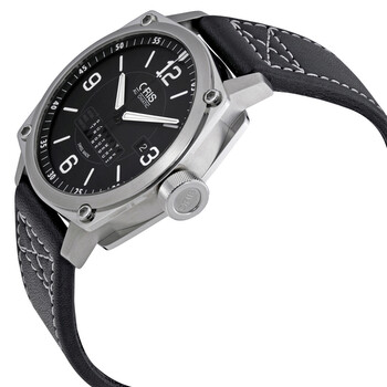 Stainless steel case with a black leather strap. Fixed stainless steel bezel. Black dial with luminous hands and index hour markers. Arabic numerals mark the 3, 6, 9 and 12 o'clock position. Minute markers around the outer rim. Dial Type: Analog. Luminescent hands and markers. Date display at the 3 o'clock position. Linea day of the week display above the 6 o'clock position. Automatic movement with a 38-hour power reserve. Scratch resistant sapphire crystal. Screw down crown. Skeleton case back. Case diameter: 42.70 mm. Case thickness: 12.4 mm. Round case shape. Band width: 22 mm. Fold over clasp. Water resistant at 100 meters/ 330 feet. Functions: hours, minutes, seconds, calendar. Dress watch style. Watch label: Swiss Made. Oris BC4 Retrograde Day Black Dial Automatic Men's Watch 735-7617-4164LS.