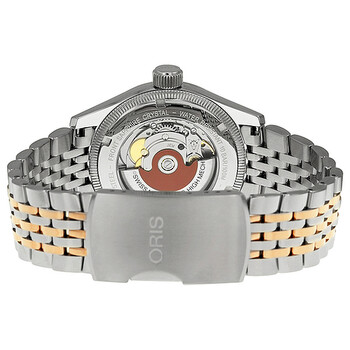 Silver-tone stainless steel case with a two-tone (silver and rose gold-plated) stainless steel bracelet. Fixed rose gold-plated stainless steel bezel. Black dial with rose gold-tone hands and alternating stick and Arabic numeral hour markers. Minute markers around the outer rim. Dial Type: Analog. Luminescent hands and markers. Date display around an inner ring. Oris Calibre 754, base SW 200-1 automatic movement with a 38-hour power reserve. Scratch resistant sapphire crystal. Skeleton case back. Case size: 39 mm. Case thickness: 12 mm. Round case shape. Band width: 20 mm. Deployment with push button release clasp. Water resistant at 100 meters / 330 feet. Functions: date, hour, minute, second. Dress watch style. Watch label: Swiss Made. Item Variations: 754 7679 4364MB, 754.7679.4364MB, 75476794364MB. Oris Big Crown Automatic Black Dial Men's Watch 754-7679-4364MB.