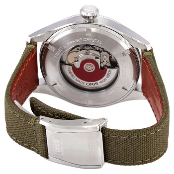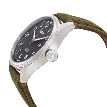 Stainless steel case with a green fabric strap. Fixed stainless steel bezel. Grey dial with luminouis silver-tone hands and Arabic numeral hour markers. Minute markers around the outer rim. Dial Type: Analog. Luminescent hands and markers. Day of the week and date display at the 3 o'clock position. Oris calibre 752 automatic movement, based upon SW 220-1, containing 26 Jewels, bitting at 28800 vph, and has a power reserve of approximately 38 hours. Scratch resistant sapphire crystal. Screw down crown. Transparent case back. Round case shape. Case size: 44 mm. Deployment clasp with a push button release. Water resistant at 100 meters / 330 feet. Functions: date, day, hour, minute, second. Big Crown Series. Casual watch style. Watch label: Swiss Made. Oris Big Crown Automatic Grey Dial Men's Watch 01 752 7760 4063-07 3 22 02LC.