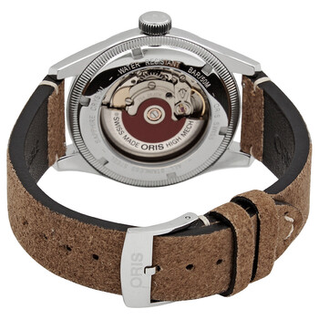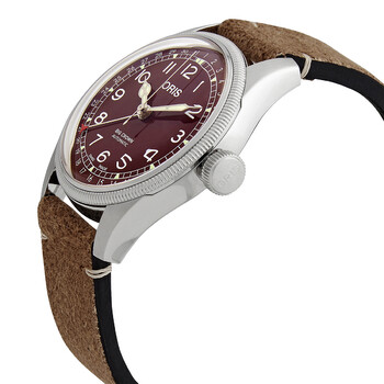 Stainless steel case with a brown (calfskin) leather strap. Fixed stainless steel bezel. Red dial with luminous silver-tone hands and Arabic numeral hour markers. Minute markers. Date scale around the outer rim (pointer date). Dial Type: Analog. Luminescent hands and markers. Oris calibre 754, base SW 200-1 automatic movement, based upon SW 200-1, containing 26 Jewels, bitting at 28800 vph, and has a power reserve of approximately 38 hours. Scratch resistant sapphire crystal. Screw down crown. Transparent case back. Round case shape. Case size: 40 mm. Case thickness: 20 mm. Band width: 20 mm. Tang clasp. Water resistant at 50 meters / 165 feet. Functions: date, hour, minute, second. Big Crown Series. Casual watch style. Watch label: Swiss Made. Oris Big Crown Automatic Red Dial Brown Leather Men's Watch 01 754 7741 4068-07 5 20 50.
