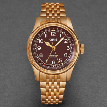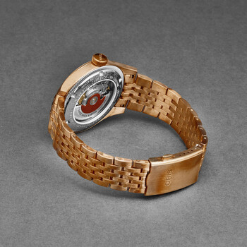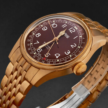 Brown bronze case with a brown stainless steel bracelet. Fixed brown bronze bezel. Red dial with rose gold-tone hands and Arabic numeral hour markers. Minute markers around the outer rim. Dial Type: Analog. Luminescent hands and markers. Date around the outer rim. Oris Calibre 754, base SW 200-1 Automatic movement, based upon SW 200-1, containing 26 Jewels, bitting at 28800 vph, and has a power reserve of approximately 38 hours. Scratch resistant sapphire crystal. Transparent case back. Round case shape, case size: 40 mm, case thickness: 12 mm. Band width: 20 mm, band length: 8 inches. Deployment with push button release clasp. Water resistant at 50 meters / 165 feet. Functions: date, hour, minute, second. Additional Info: centre hands for hours, minutes and seconds, date centre hand, instantaneous date, date corrector, fine timing device and stop-second. Big Crown Series. Casual watch style. Watch label: Swiss Made. Oris Big Crown Automatic Red Dial Men's Watch 754 7741 3168-07 8 20 01.