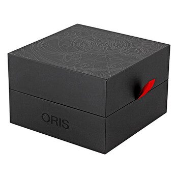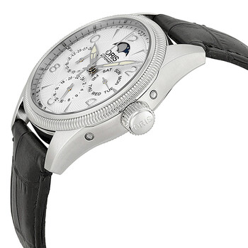 Stainless steel case with a black rubber strap. Fixed bezel. Silver dial with silver-tone hands and alternating Arabic numeral and index hour markers. Dial Type: Analog. Luminescent hands. Day, date. Three sub-dial displays: Day, date and 24 hour. Automatic movement. Eta 2671 engine. Scratch resistant sapphire crystal. Screw down crown. Screw down skeleton case back. Case diameter: 40 mm. Round case shape. Band width: 20 mm. Fold over clasp. Water resistant at 100 meters / 330 feet. Functions: date, day, hour, minute, second. Additional Info: moon phases. Luxury watch style. Watch label: Swiss Made. Oris Big Crown Complication Automatic Silver Dial Black Rubber Strap Men's Watch 582-7678-4061RS.