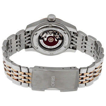 Two-tone (silver-tone and rose gold-tone) stainless steel case with a two-tone (silver-tone and rose gold-tone) stainless steel bracelet. Fixed bezel. Black dial with rose gold-tone hands and index-Arabic numerals hour markers. Dial Type: Analog. Luminescent hands. Pointer date. Oris Calibre 584, base ETA 2688/2671 automatic movement with a 38-hour power reserve. Scratch resistant sapphire crystal. Screw down crown. Transparent case back. Round case shape. Case size: 30 mm. Band width: 15 mm. Folding clasp. Water resistant at 100 meters / 330 feet. Functions: date, hour, minute, second. Dress watch style. Watch label: Swiss Made. Oris Big Crown Pointer Date Automatic Black Dial Ladies Watch 01 584 7626 4364-07 8 15 78.