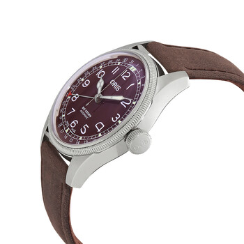 Stainless steel case with a brown (calfskin) leather strap. Fixed stainless steel bezel. Red dial with luminous silver-tone hands and Arabic numeral hour markers. Minute markers. Date scale (pointer date) around the outer rim. Dial Type: Analog. Luminescent hands and markers. Oris calibre 754, base SW 200-1 automatic movement, based upon SW 200-1, containing 26 Jewels, bitting at 28800 vph, and has a power reserve of approximately 38 hours. Scratch resistant sapphire crystal. Screw down crown. Transparent case back. Round case shape. Case size: 40 mm. Case thickness: 11.7 mm. Band width: 20 mm. Tang clasp. Water resistant at 50 meters / 165 feet. Functions: date, hour, minute, second. Big Crown Series. Casual watch style. Watch label: Swiss Made. Oris Big Crown Pointer Date Automatic Red Dial Men's Watch 01 754 7741 4068-07 5 20 64.