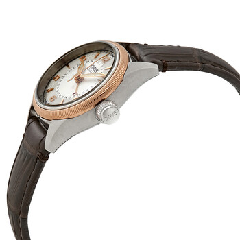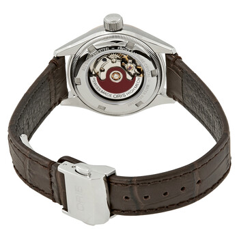 Stainless steel case with a dark brown leather strap. Fixed bezel. Silver dial with rose gold-tone hands and Arabic numeral and index hour markers. Minute markers around the outer rim. Dial Type: Analog. Luminescent hands and markers. One - date. Automatic movement. Scratch resistant Sapphire crystal. Transparent exhibition see through case back. Case diameter: 29 mm. Round case shape. Folding clasp. Water resistant at 100 meters / 330 feet. Functions: date, hour, minute, second. Casual watch style. Watch label: Swiss Made. Oris Big Crown Pointer Date Automatic Silver Dial Dark Brown Leather Ladies Watch 01 594 7680 4361-07 5 14 77FC.