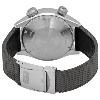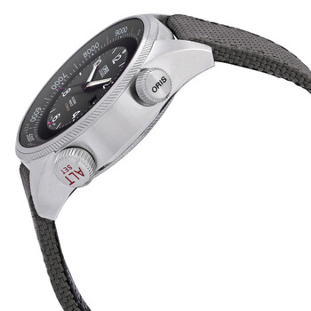 Silver-tone stainless steel case with a black fabric strap. Fixed silver-tone stainless steel bezel. Black dial with silver-tone hands and index-Arabic numeral hour markers. Altimeter scale around the outer rim. Dial Type: Analog. Luminescent hands and markers. Date display at the 3 o'clock position. Sellita Caliber SW200 Automatic movement, containing 26 Jewels, bitting at 28800 vph, and has a power reserve of approximately 38 hours. Scratch resistant sapphire crystal. Screw down crown. Solid case back. Round case shape, case size: 47 mm, case thickness: 17.7 mm. Band width: 23 mm. Deployment clasp. Water resistant at 100 meters / 330 feet. Functions: date, hour, minute, second. Big Crown Pro Pilot Altimeter Series. Casual watch style. Watch label: Swiss Made. Oris Big Crown Pro Pilot Altimeter Automatic Black Dial Men's Watch 01 733 7705 4134-07 5 23 15FC.