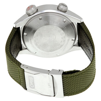 Silver-tone stainless steel case with a green fabric strap. Fixed silver-tone stainless steel bezel. Black dial with luminous hands and index and Arabic numeral hour markers. Minute markers. altimeter & barometer markings. Dial Type: Analog. Luminescent hands. Date display at the 3 o'clock position. Oris Calibre 733 Automatic movement, based upon Sellita SW200-1, containing 26 Jewels, bitting at 28800 vph, and has a power reserve of approximately 38 hours. Scratch resistant sapphire crystal. Screw down crown. Solid case back. Round case shape, case size: 47 mm, case thickness: 18 mm. Band width: 24 mm, band length: 8 inches. Fold over with safety release clasp. Water resistant at 100 meters / 330 feet. Functions: date, hour, minute, second. Big Crown Propilot Series. Pilot watch style. Watch label: Swiss Made. Oris Big Crown ProPilot Altimeter with Feet Scale Watch 733-7705-4134GRFS.