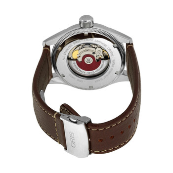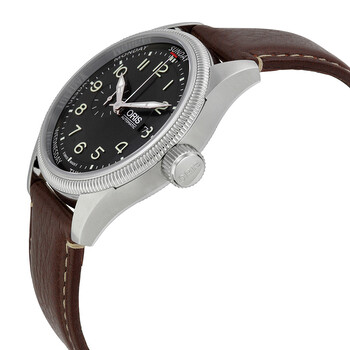 Stainless steel case with a brown leather strap. Fixed stainless steel bezel. Black dial with silver-tone hands and Arabic numeral hour markers. Minute markers. Days of the week around the outer rim. Dial Type: Analog. Luminescent hands and markers. Date display at the 3 o'clock position. Seconds sub-dial at the 9 o'clock position. Automatic movement with a 38 hour power reserve. Scratch resistant sapphire crystal. Screw down crown. Skeleton case back. Case diameter: 44 mm. Case thickness: 11.70 mm. Round case shape. Band width: 22 mm. Band length: 8 inches. Deployment with push button clasp. Water resistant at 100 meters / 330 feet. Functions: day, date, hour, minute, second. Dress watch style. Watch label: Swiss Made. Oris Big Crown ProPilot Automatic Black Dial Brown Leather Men's Watch 745-7688-4034LS.
