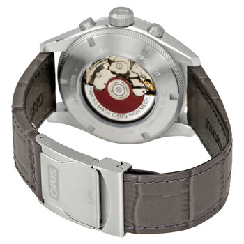 Stainless steel case with a grey leather strap. Fixed stainless steel bezel. Grey dial with luminous silver-tone hands and Arabic numeral hour markers. Minute markers. Telemeter markings around the outer rim. Dial Type: Analog. Luminescent hands and markers. Date display between the 4 and 5 o'clock positions. Chronograph - three sub-dials displaying: 60 second, 30 minute and 12 hour. Oris calibre 774, base SW 500 automatic movement with a 48-hour power reserve. Scratch resistant sapphire crystal. Screw down crown. Transparent case back. Case size: 43 mm. Round case shape. Band width: 22 mm. Deployment clasp. Water resistant at 100 meters / 330 feet. Functions: chronograph, date, hour, minute, second. Additional Info: suitable for swimming and shallow snorkeling; may be unsuitable for diving. Casual watch style. Watch label: Swiss Made. Oris Big Crown ProPilot Automatic Chronograph Men's Watch 774-7699-4063GYLS.