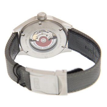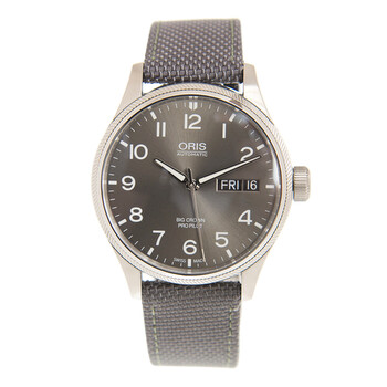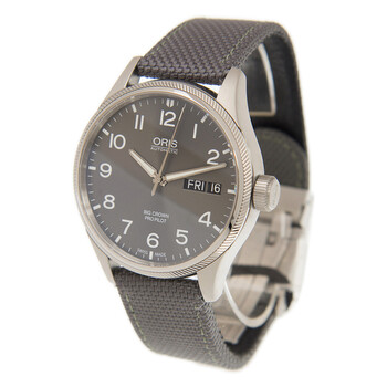 Silver-tone stainless steel case with a grey nylon strap. Fixed silver-tone stainless steel bezel. Grey dial with silver-tone hands and index hour markers. Minute markers around the outer rim. Dial Type: Analog. Day of the week and date display at the 3 o'clock position. Oris Calibre 752, base SW 220-1 automatic movement with a 38-hour power reserve. Scratch resistant sapphire crystal. Transparent case back. Round case shape. Case size: 45 mm. Deployment clasp. Water resistant at 100 meters / 330 feet. Functions: date, day, hour, minute, second. Additional Info: original box, international warranty card, manual (complete accessories). Luxury watch style. Watch label: Swiss Made. Oris Big Crown Propilot Big Day Date Automatic Grey Dial Unisex Watch 752 7698 4063 5 22 17FC.
