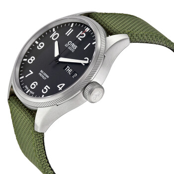 Silver-tone stainless steel case with a green textile strap. Fixed silver-tone stainless steel bezel. Black dial with luminous silver-tone hands and Arabic numeral hour markers. Minute markers around the outer rim. Dial Type: Analog. Luminescent hands and markers. Day of the week and date display at the 3 o'clock position. Oris Calibre 752 Automatic movement, based upon SW 220-1, containing 26 Jewels, bitting at 28800 vph, and has a power reserve of approximately 38 hours. Scratch resistant sapphire crystal. Screw down crown. Transparent case back. Round case shape, case size: 45 mm, case thickness: 12.6 mm. Band width: 22 mm. Lift clasp. Water resistant at 100 meters / 330 feet. Functions: date, day, hour, minute, second. Big Crown Propilot Series. Pilot watch style. Watch label: Swiss Made. Oris Big Crown ProPilot Black Dial Men's 45mm Watch 752-7698-4164GRFS.