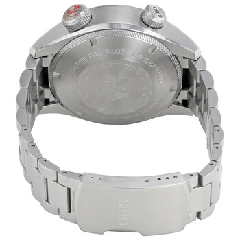 Stainless steel case with a stainless steel bracelet. Fixed stainless steel bezel. Black dial with luminous silver-tone hands and Arabic numeral and index hour markers. Minute markers. Altimeter & barometer markings. Dial Type: Analog. Luminescent hands and markers. Date display at the 3 o'clock position. Oris caliber 733 base SW 200-1 automatic movement. Scratch resistant sapphire crystal. Screw down crown. Solid case back. Case size: 47 mm. Case thickness: 18 mm. Round case shape. Band width: 23 mm. Fold over with safety release clasp. Water resistant at 100 meters / 330 feet. Functions: date, hour, minute, second, altimeter, barometer. Casual watch style. Oris Big Crown ProPilot Black Dial Stainless Steel Men's Watch 733-7705-4164MB.