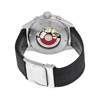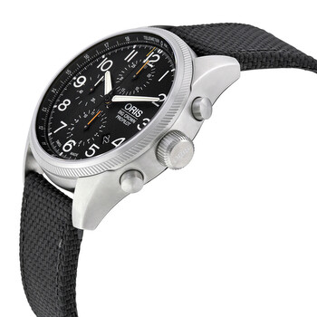 Stainless steel case with a black canvas strap. Fixed stainless steel bezel. Black dial with luminous silver-tone hands and Arabic numeral hour markers. Minute markers. Telemeter markings around the outer rim. Dial Type: Analog. Luminescent hands and markers. Date display between the 4 and 5 o'clock positions. Chronograph - three sub-dials displaying: 60 second, 30 minute and 12 hour. Oris calibre 774, base SW 500 automatic movement with a 48-hour power reserve. Scratch resistant sapphire crystal. Screw down crown. Skeleton case back. Round case shape. Case size: 44 mm. Band width: 22 mm. Deployment clasp. Water resistant at 100 meters / 330 feet. Functions: chronograph, date, hour, minute, second. Casual watch style. Watch label: Swiss Made. Oris Big Crown ProPilot Chronograph Black Dial Black Canvas Men's Watch 774-7699-4134BKFS.