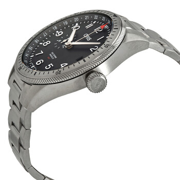 Stainless steel case with a stainless steel bracelet. Fixed stainless steel bezel. Black dial with luminous silver-tone hands and Arabic numeral hour markers. Minute markers. 24 hour markers around the outer rim. Dial Type: Analog. Luminescent hands and markers. Date display at the 3 o'clock position. Small seconds sub-dial at the 9 o'clock position. Oris calibre 748 automatic movement, based upon Sellita SW220-1, containing 28 Jewels, bitting at 28800 vph, and has a power reserve of approximately 38 hours. Scratch resistant sapphire crystal. Screw down crown. Transparent case back. Round case shape. Case size: 44 mm. Band width: 22 mm. Fold over clasp with a push button release. Water resistant at 100 meters / 330 feet. Functions: big date, GMT, second time zone, hour, minute, small second. Pilot watch style. Watch label: Swiss Made. Oris Big Crown ProPilot Timer GMT Automatic Black Dial Men's Watch 01 748 7756 4064-07 8 22 08.