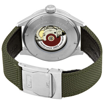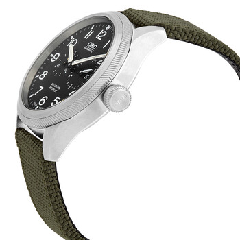Stainless steel case with a olive green textile strap. Fixed stainless steel bezel. Black dial with luminous silver-tone hands and Arabic numeral hour markers. Minute markers around the outer rim. Dial Type: Analog. Luminescent hands and markers. Date display at the 3 o'clock position. Chronograph - two sub-dials displaying: 60 second and 12 hours. Oris 690, base ETA 2836-2 automatic movement with a 38-hour power reserve. Scratch resistant sapphire crystal. Screw down crown. Transparent case back. Round case shape. Case size: 44.70 mm. Band width: 22 mm. Fold over clasp. Water resistant at 100 meters / 330 feet. Functions: chronograph, date, hour, minute, second. Big Crown Propilot Worldtimer Series. Casual watch style. Watch label: Swiss Made. Oris Big Crown ProPilot Worldtimer Chronograph Automatic Black Dial Men's Watch 01 690 7735 4164-07 5 22 14FC.