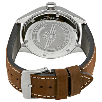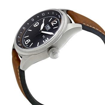 Stainless steel case with a brown leather strap. Fixed stainless steel bezel. Black dial with luminous silver-tone hands and index hour markers. Arabic numerals appear at the 3, 6, 9 and 12 o'clock positions. Minute markers. Pulsometer / pulsations markers around the outer rim. Dial Type: Analog. Luminescent hands and markers. Day of the week and date display at the 3 o'clock position. Oris calibre 735, base SW 220-1 automatic movement, based upon Sellita SW220-1, containing 26 Jewels, bitting at 28800 vph, and has a power reserve of approximately 38 hours. Scratch resistant sapphire crystal. Screw down crown. Solid case back. Round case shape. Case size: 45 mm. Case thickness: 12.6 mm. Band width: 22 mm. Tang clasp. Water resistant at 30 meters / 100 feet. Functions: date, day, hour, minute, second, pulsometer. Additional Info: limited edition ii. Big Crown Royal Flying Doctor Service Series. Dress watch style. Watch label: Swiss Made. Oris Big Crown Royal Flying Doctor Service Automatic Men's Limited Edition Watch 01 735 7728 4084-Set LS.