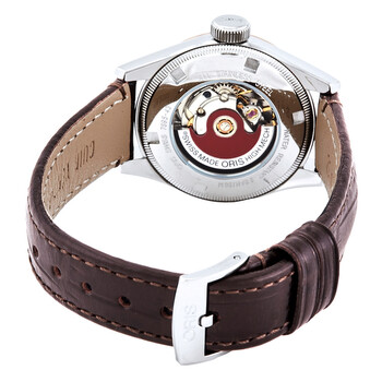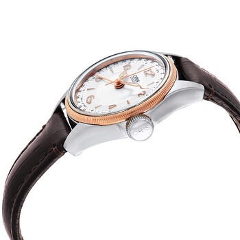 Silver-tone stainless steel case with a brown leather strap. Fixed rose gold-tone stainless steel bezel. Silver dial with rose gold-tone cathedral-style hands and Arabic and index hour markers. Date markers around the outer rim. Dial Type: Analog. Pointer date. One - date subdial. Oris Calibre 594, base ETA 2671 automatic movement with a 38-hour power reserve. Scratch resistant sapphire crystal. Transparent case back. Round case shape. Case size: 29 mm. Fold over clasp. Water resistant at 50 meters / 165 feet. Functions: hour, minute, second. Luxury watch style. Watch label: Swiss Made. Oris Big Crown Silver Dial Brown Leather Automatic Ladies Watch 594-7695-4361LS.