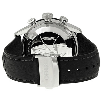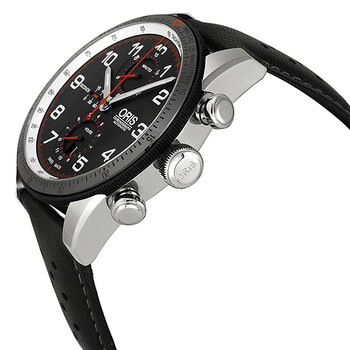 Stainless steel case with a black leather strap. Fixed ceramic bezel with minute markings. Black dial with silver-tone hands and Arabic numeral hour markers. Minute markers. Tachymeter around the outer rim. Dial Type: Analog. Luminescent hands and markers. Date display at the 6 o'clock position. Chronograph - three sub-dials displaying: 60 second, 30 minute and 12 hour. Automatic movement. Scratch resistant sapphire crystal. Screw down crown. Solid case back. Case diameter: 44 mm. Round case shape. Band width: 22 mm. Deployment clasp with push button. Water resistant at 100 meters / 330 feet. Functions: chronograph, date, hour, minute, second. Dress watch style. Watch label: Swiss Made. Oris Calobra Limited Edition Automatic Chronograph Black Dial Steel Men's Watch 774-7661-4484.