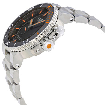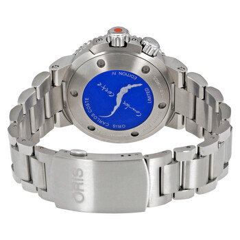 Titanium case with a titanium bracelet. Uni-directional rotating titanium bezel with a black top ring. Black dial with luminous silver-tone hands and index hour markers. Minute markers around the outer rim. Dial Type: Analog. Luminescent hands and markers. Date display at the 3 o'clock position. Small seconds sub-dial at the 9 o'clock position. Oris calibre 743 Base SW 220-1 automatic movement with a 38-hour power reserve. Scratch resistant sapphire crystal. Screw down crown. Solid case back. Case size: 46 mm. Case thickness: 15.50 mm. Round case shape. Band width: 25 mm. Band length: 8 inches. Deployment clasp with a push button release. Water resistant at 50 meters / 165 feet. Functions: date, hour, minute, second. Additional Info: helium escape valve. Limited to 2000 pieces. Luxury watch style. Watch label: Swiss Made. Oris Carlos Coste Limited Edition IV Men's Watch 743-7709-7184MB.