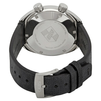 Stainless steel case with a black leather strap. Fixed stainless steel bezel. Grey and black dial with luminous silver-tone hands and index hour markers. Minute markers. Arabic numeral minute markers (at 5 minute intervals). around the outer rim. Dial Type: Analog. Luminescent hands and markers. Date display at the 3 o'clock position. Oris calibre 733 automatic movement, based upon Sellita SW200-1, containing 26 Jewels, bitting at 28800 vph, and has a power reserve of approximately 38 hours. Scratch resistant sapphire crystal. Screw down crown. Solid case back. Round case shape. Case size: 39 mm. Band width: 19 mm. Tang clasp. Water resistant at 100 meters / 330 feet. Functions: date, hour, minute, second. Chronoris Series. Casual watch style. Watch label: Swiss Made. Oris Chronoris Auomatic Grey Dial Men's Watch 01 733 7737 4053-07 5 19 44.