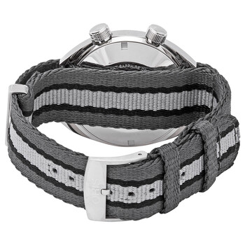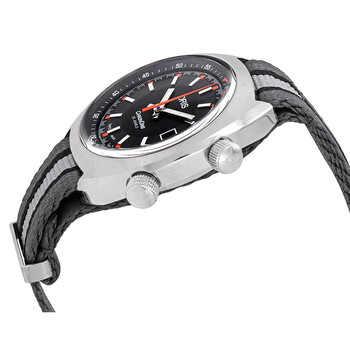 Stainless steel case with a grey textile (NATO) strap. Fixed smooth stainless steel bezel. Black dial with luminous silver-tone hands and index hour markers. Arabic numeral minute markers (at 5 minute intervals). Minute markers around the outer rim. Dial Type: Analog. Luminescent hands and markers. Date display at the 3 o'clock position. Oris calibre 733 automatic movement, based upon Sellita SW200-1, containing 26 Jewels, bitting at 28800 vph, and has a power reserve of approximately 38 hours. Scratch resistant sapphire crystal. Screw down crown. Solid case back. Round case shape. Case size: 39 mm. Band width: 19 mm. Tang clasp. Water resistant at 100 meters / 330 feet. Functions: date, hour, minute, second. Chronoris Series. Casual watch style. Watch label: Swiss Made. Oris Chronoris Automatic Black Dial Grey Textile Men's Watch 01 733 7737 4054-07 5 19 24.