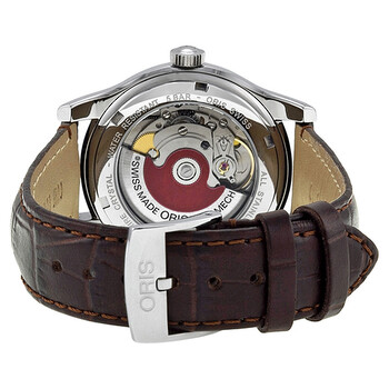 18kt rose gold-tone stainless steel case with a brown leather strap. Fixed 18kt rose gold-tone stainless steel bezel. Silver-tone dial with rose gold-tone hands and index hour markers. Minute markers around the outer rim. Dial Type: Analog. Luminescent hands and markers. Date display at the 6 o'clock position. Oris Calibre 733 automatic movement with a 38-hour power reserve. Scratch resistant mineral crystal. Tetured steel crown. Skeleton case back. Round case shape. Case size: 37 mm. Band length: 7 inches. Tang clasp. Water resistant at 100 meters / 330 feet. Functions: date, hour, minute, second. Casual watch style. Watch label: Swiss Made. Item Variations: 733 7578 4351LS, 733.7578.4351LS, 73375784351LS. Oris Classic Automatic Men's Watch 01 733 7578 4351-07 5 18 10.