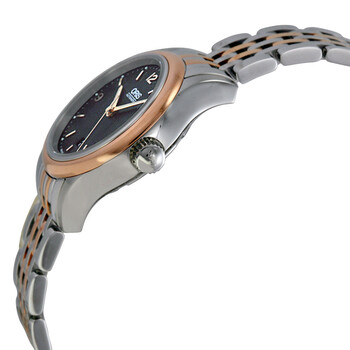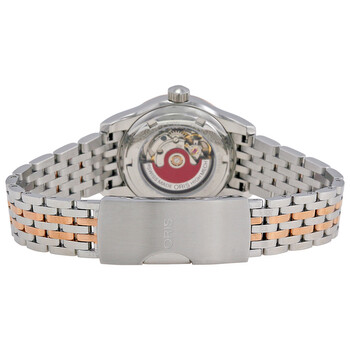 Stainless steel case with a two-tone (silver-tone and rose gold PVD ) stainless steel bracelet. Fixed rose gold PVD bezel. Black dial with luminous rose gold-tone hands and index hour markers. Arabic numerals mark the 3, 9 and 12 o'clock positions. Minute markers around the outer rim. Dial Type: Analog. Luminescent hands. Date display at the 6 o'clock position. Oris calibre 561, base ETA 2671 automatic movement with a 38-hour power reserve. Scratch resistant sapphire crystal. Pull / push crown. Transparent case back. Round case shape. Case size: 28.5 mm. Fold over clasp. Water resistant at 50 meters / 165 feet. Functions: date, hour, minute, second. Casual watch style. Watch label: Swiss Made. Oris Classic Date Automatic Black Dial Ladies Watch 01 561 7650 4334-07 8 14 63.