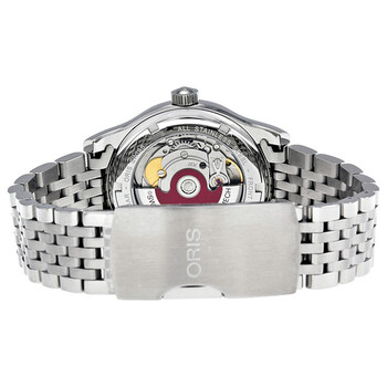 Stainless steel case with a stainless steel bracelet. Fixed stainless steel bezel. Black dial with silver-tone hands and index hour markers. Minute markers around the outer rim. Dial Type: Analog. Luminescent hands. Date display at the 6 o'clock position. Oris calibre 733 automatic movement with a 38-hour power reserve. Scratch resistant sapphire crystal. Transparent case back. Round case shape. Case size: 37 mm. Case thickness: 9 mm. Band width: 20 mm. Fold over clasp with a push button release. Water resistant at 50 meters / 165 feet. Functions: date, hour, minute, second. Casual watch style. Watch label: Swiss Made. Item Variations: 733 7578 4054MB, 733.7578.4054MB, 73375784054MB. Oris Classic Date Automatic Black Dial Men's Watch 733-7578-4054MB.
