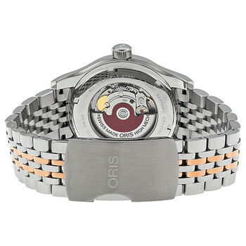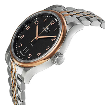Stainless steel case with a two-tone (silver-tone and 18kt rose gold PVD) stainless bracelet. Fixed 18kt rose gold PVD bezel. Black dial with rose gold-tone hands and Arabic numeral hour markers. Minute markers around the outer rim. Dial Type: Analog. Luminescent hands and markers. Date display appears at the 6 o'clock position. Automatic movement. Scratch resistant sapphire crystal. Skeleton case back. Case diameter: 42 mm. Round case shape. Band width: 20 mm. Fold over clasp. Water resistant at 50 meters / 165 feet. Functions: date, hour, minute, second. Dress watch style. Watch label: Swiss Made. Oris Classic Date Automatic Black Dial Rose Gold and Steel Men's Watch 01 733 7594 4394-07 8 20 63.
