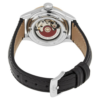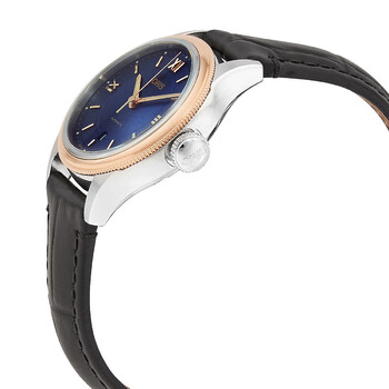 Silver-tone stainless steel case with a black leather strap. Fixed rose gold PVD stainless steel bezel. Blue guilloche dial with luminous rose gold-tone hands and index hour markers. Roman numeral appear at the 3, 9 and 12 o'clock positions. Minute markers around the outer rim. Dial Type: Analog. Luminescent hands. Date display at the 6 o'clock position. Oris Calibre 561, base ETA 2671 Automatic movement, based upon ETA 2671, containing 25 Jewels, bitting at 28800 vph, and has a power reserve of approximately 38 hours. Scratch resistant sapphire crystal. Pull / push crown. Transparent case back. Round case shape, case size: 28.5 mm. Band width: 14 mm. Tang clasp. Water resistant at 50 meters / 165 feet. Functions: date, hour, minute, second. Classic Date Series. Luxury watch style. Watch label: Swiss Made. Oris Classic Date Automatic Blue Dial Ladies Watch 01 561 7718 4375-07 5 14 35.