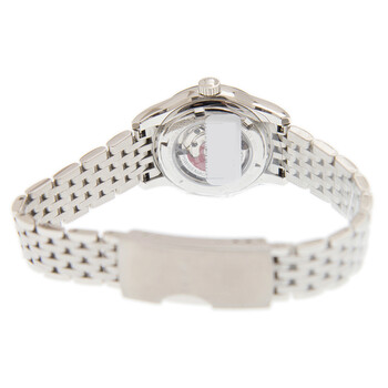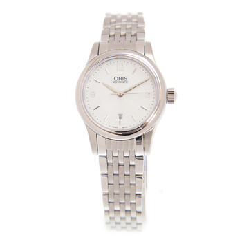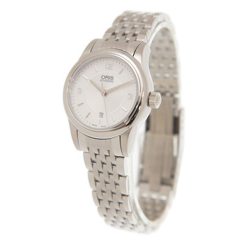 Silver-tone stainless steel case with a silver-tone stainless steel bracelet. Fixed silver-tone stainless steel bezel. Silver-tone dial with silver-tone hands and Arabic numeral and index hour markers. Minute markers around the outer rim. Dial Type: Analog. Date display at the 6 o'clock position. Oris Calibre 561, base ETA 2671 automatic movement with a 38-hour power reserve. Scratch resistant sapphire crystal. Pull / push crown. Transparent case back. Round case shape. Case size: 28.5 mm. Fold over clasp. Water resistant at 50 meters / 165 feet. Functions: date, hour, minute, second. Additional Info: original box, international warranty card, manual (complete accessories). Luxury watch style. Watch label: Swiss Made. Oris Classic Date Automatic Silver Dial Unisex Watch 561 7650 4031 8 14 61.