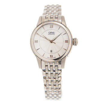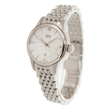 Silver-tone stainless steel case with a silver-tone stainless steel bracelet. Fixed silver-tone stainless steel bezel. Silver-tone dial with silver-tone hands and Roman numeral and index hour markers. Minute scale around the inner rim. Dial Type: Analog. Date display at the 6 o'clock position. Oris Calibre 561, base ETA 2671 automatic movement with a 38-hour power reserve. Scratch resistant sapphire crystal. Pull / push crown. Transparent case back. Round case shape. Case size: 31 mm. Water resistant at 50 meters / 165 feet. Functions: date, hour, minute, second. Additional Info: original box, international warranty card, manual (complete accessories). Luxury watch style. Watch label: Swiss Made. Oris Classic Date Automatic Silver Dial Unisex Watch 561 7687 4071 8 14 77.