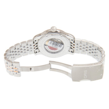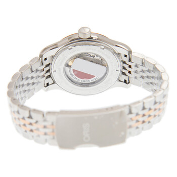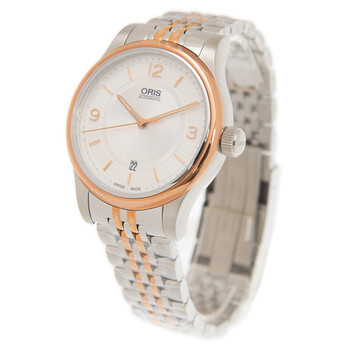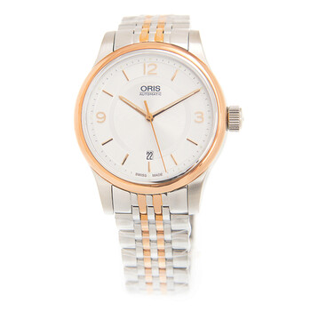 Silver-tone stainless steel case with a silver-tone stainless steel bracelet. Fixed gold-tone bezel. Silver-tone dial with gold-tone hands and Arabic numeral and index hour markers. Minute markers around the outer rim. Dial Type: Analog. Date display at the 6 o'clock position. Oris Calibre 733 automatic movement with a 38-hour power reserve. Scratch resistant sapphire crystal. Transparent case back. Round case shape. Case size: 42 mm. Water resistant at 50 meters / 165 feet. Functions: date, hour, minute, second. Additional Info: original box, international warranty card, manual (complete accessories). Luxury watch style. Watch label: Swiss Made. Oris Classic Date Automatic Silver Dial Unisex Watch 733 7594 4331 8 20 63.