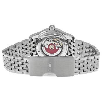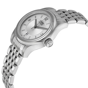 Stainless steel case with a stainless steel bracelet. Fixed stainless steel bezel. Silver dial with silver-tone hands and index hour markers. Arabic numerals mark the 3, 9 and 12 o'clock positions. Minute markers around the outer rim. Dial Type: Analog. Date display at the 6 o'clock position. Automatic movement. Scratch resistant sapphire crystal. Pull / push crown. Transparent case back. Case diameter: 28.5 mm. Round case shape. Folding clasp. Water resistant at 50 meters / 165 feet. Functions: date, hour, minute, second. Casual watch style. Watch label: Swiss Made. Oris Classic Date Silver Dial Stainless Steel Ladies Watch 01 561 7650 4031-07 8 14 61.