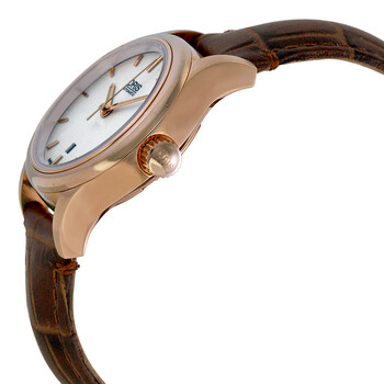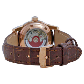 Rose gold PVD stainless steel case with a brown alligator leather strap. Fixed rose gold PVD bezel. White dial with rose gold-tone hands and index hour markers. Minute markers around the outer rim. Dial Type: Analog. Date display at the 6 o'clock position. Automatic movement with a 38 hour power reserve. Scratch resistant sapphire crystal. Skeleton case back. Case diameter: 28.5 mm. Round case shape. Fold over clasp. Water resistant at 50 meters / 165 feet. Functions: date, hour, minute, second. Watch label: Swiss Made. Oris Date White Dial Brown Leather Ladies Back Watch 561-7650-4851LS.