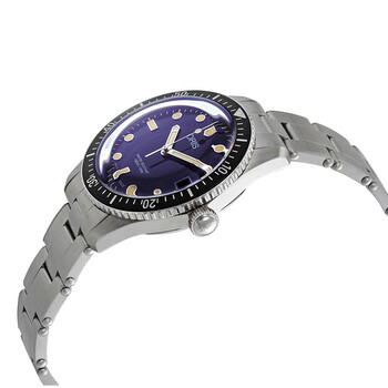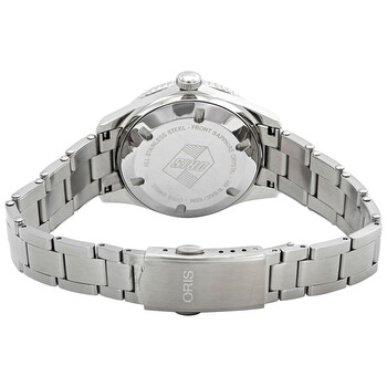 Silver-tone stainless steel case with a silver-tone stainless steel bracelet. Uni-directional rotating coin edge black top ring stainless steel bezel. Blue dial with silver-tone hands and dot hour markers. Minute markers around the outer rim. Dial Type: Analog. Luminescent hands and markers. Date display at the 3 o'clock position. Oris Calibre 733 Automatic movement, based upon Sellita SW200-1, containing 26 Jewels, bitting at 28800 vph, and has a power reserve of approximately 38 hours. Scratch resistant sapphire crystal. Screw down crown. Solid case back. Round case shape, case size: 36 mm. Band width: 17 mm. Folding clasp. Water resistant at 100 meters / 330 feet. Functions: date, hour, minute, second. Divers Series. Casual watch style. Watch label: Swiss Made. Oris Divers Automatic Blue Dial Mid-size Watch 01 733 7747 4055-07 8 17 18.