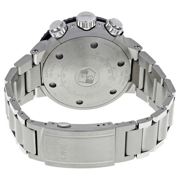 Titanium case with a titanium bracelet. Uni-directional rotating titanium bezel with a black ceramic top ring. Black dial with luminous silver-tone hands and index hour markers. Minute markers around the outer rim. Dial Type: Analog. Luminescent hands and markers. Date display at the 6 o'clock position. Chronograph - three sub-dials displaying: 60 seconds, 30 minutes, and 12 hours. Oris calibre 774, base SW 500 automatic movement with a 48-hour power reserve. Scratch resistant sapphire crystal. Screw down crown. Solid case back. Case size: 51 mm. Case thickness: 19.3 mm. Round case shape. Band width: 26 mm. Fold over clasp. Water resistant at 100 meters / 330 feet. Functions: chronograph, date, hour, minute, second. Sport watch style. Watch label: Swiss Made. Oris Divers Automatic Chronograph Men's Watch 01 774 7727 7154-Set.