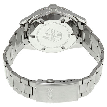 Stainless steel case with a stainless steel bracelet. Uni-directional rotating stainless steel bezel with a black DLC top ring. Green dial with luminous silver-tone hands and dot hour markers. Minute markers around the outer rim. Dial Type: Analog. Luminescent hands and markers. Date display at the 3 o'clock position. Oris calibre 733 automatic movement with a 38-hour power reserve. Scratch resistant sapphire crystal. Screw down crown. Solid case back. Case size: 42 mm. Case thickness: 13.50 mm. Round case shape. Band width: 21 mm. Fold over clasp. Water resistant at 100 meters / 330 feet. Functions: date, hour, minute, second. Sport watch style. Watch label: Swiss Made. Oris Divers Automatic Green Dial Men's Watch 01 733 7720 4057-07 8 21 18
