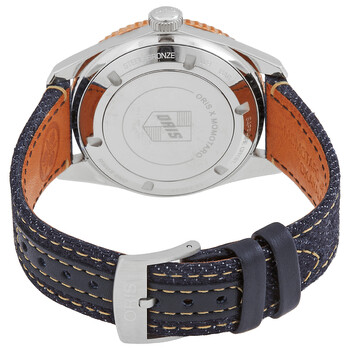 Silver-tone stainless steel case with a blue fabric strap. Uni-directional rotating black bezel. Green dial with gold-tone hands and index hour markers. Minute markers around the outer rim. Dial Type: Analog. Luminescent hands and markers. Oris Calibre 733 Automatic movement, based upon Sellita SW200-1, containing 26 Jewels, bitting at 28800 vph, and has a power reserve of approximately 38 hours. Anti-reflective scratch resistant sapphire crystal. Screw down crown. Solid case back. Round case shape, case size: 40 mm, case thickness: 13.14 mm. Tang buckle clasp. Water resistant at 100 meters. Functions: hour, minute, second. Divers Series. Casual watch style. Watch label: Swiss Made. Oris Divers Automatic Green Dial Watch 01 733 7707 4337-Set.