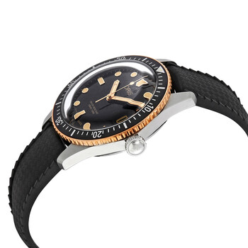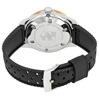 Stainless steel case with a black rubber strap. Uni-directional rotating black DLC bezel with a bronze outer rim. Black dial with luminous rose gold-tone hands and dot hour markers. Minute markers around the outer rim. Dial Type: Analog. Luminescent hands and markers. Date display at the 3 o'clock position. Oris calibre 733, base SW 200-1 automatic movement, based upon SW 200-1, containing 26 Jewels, bitting at 28800 vph, and has a power reserve of approximately 38 hours. Scratch resistant sapphire crystal. Screw down crown. Solid case back. Round case shape. Case size: 36 mm. Band width: 17 mm. Tang clasp. Water resistant at 100 meters / 330 feet. Functions: date, hour, minute, second. Casual watch style. Watch label: Swiss Made. Oris Divers Sixty Five Automatic Black Dial 36 mm Watch 01 733 7747 4354-07 4 17 18.